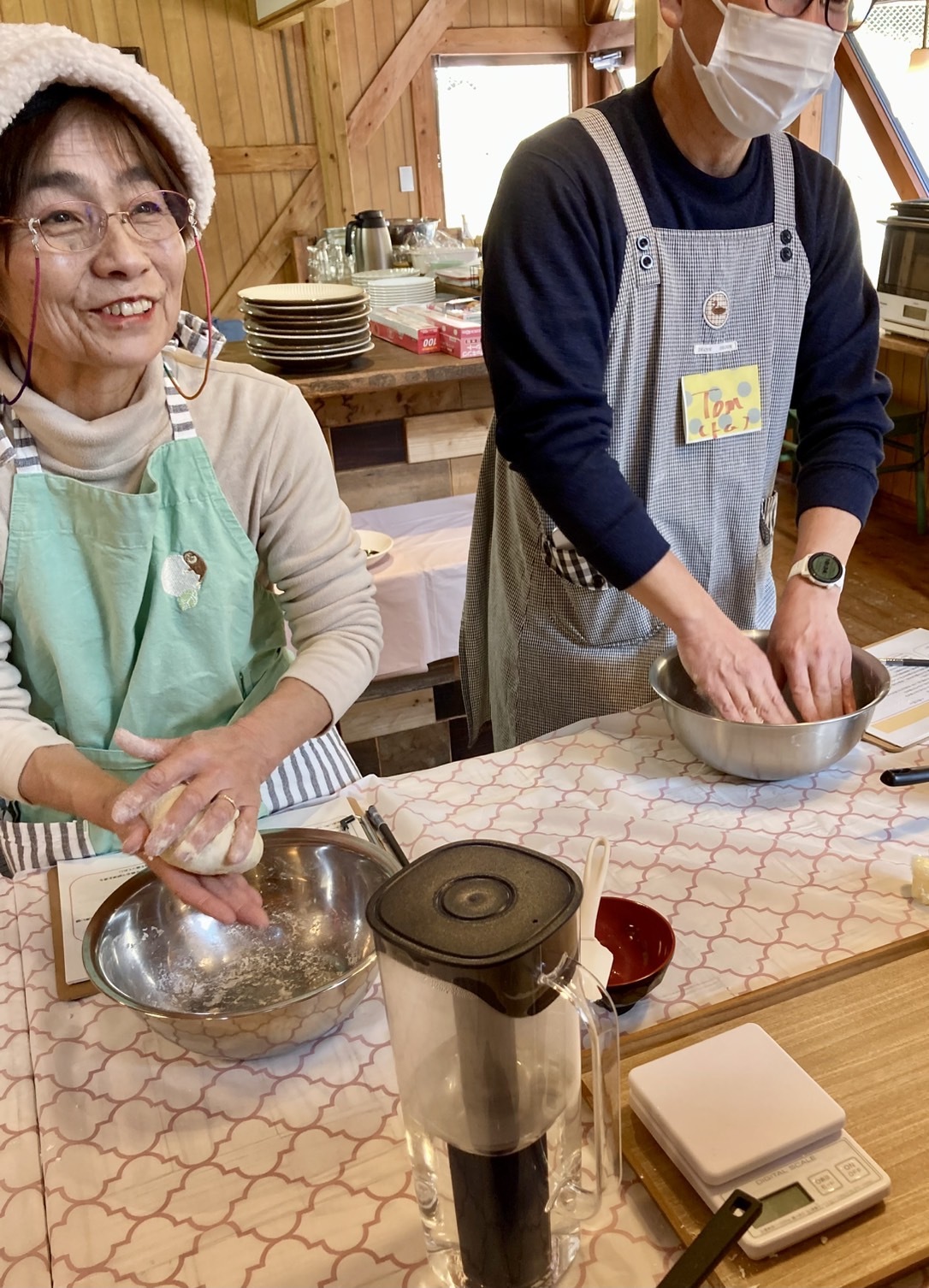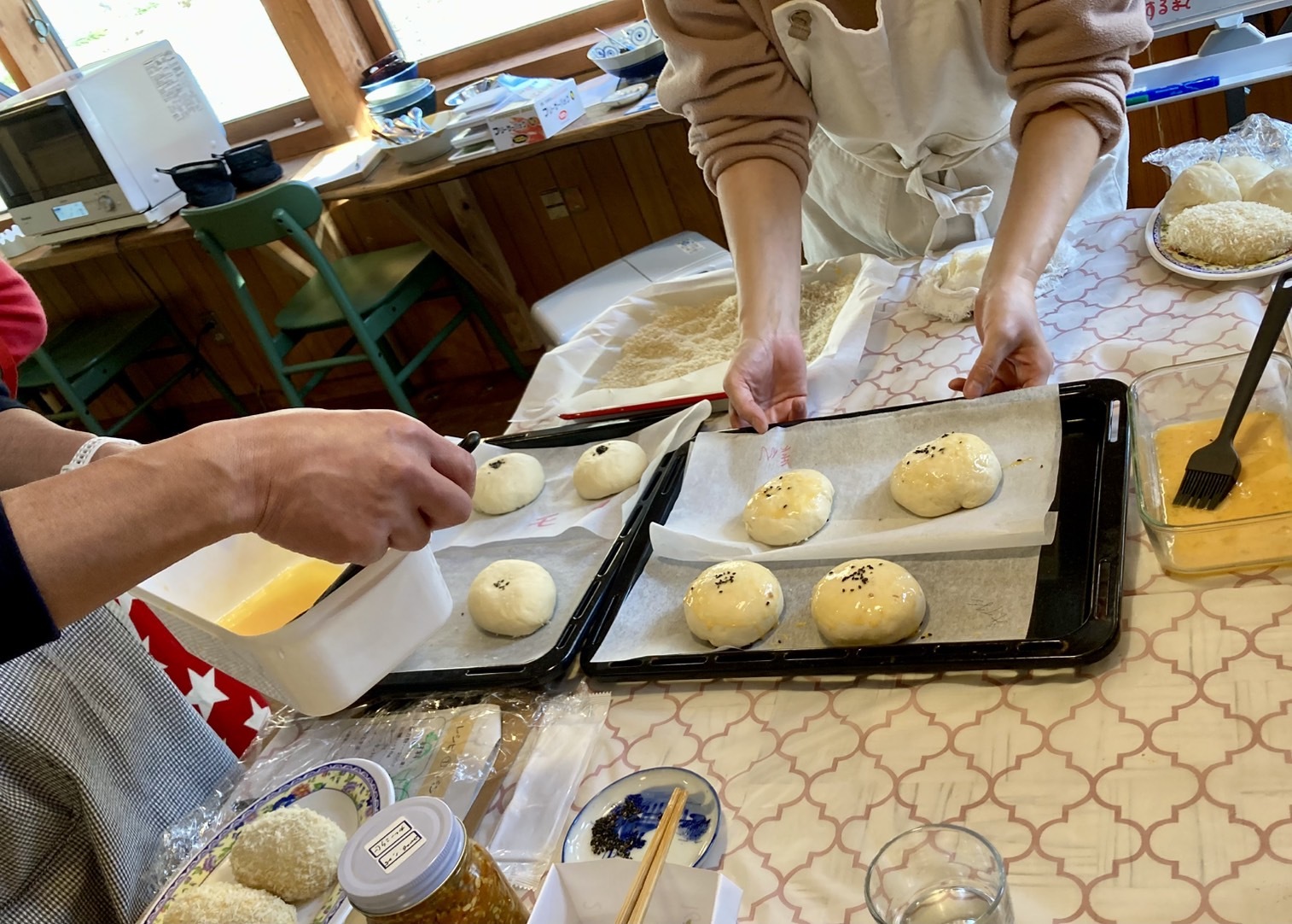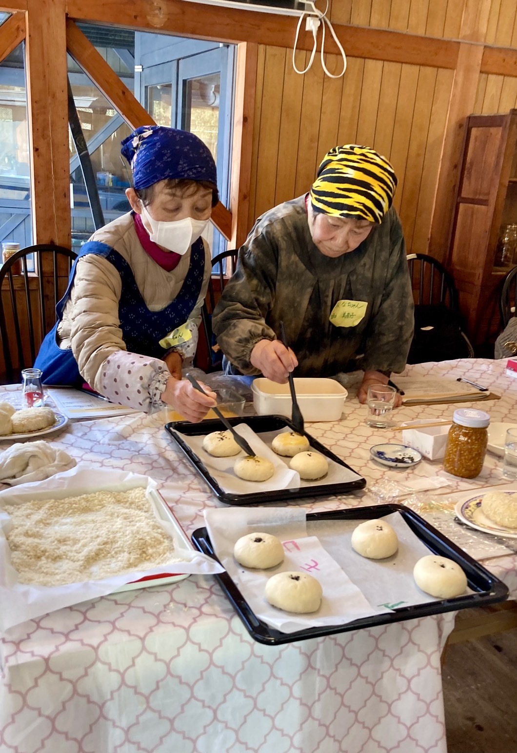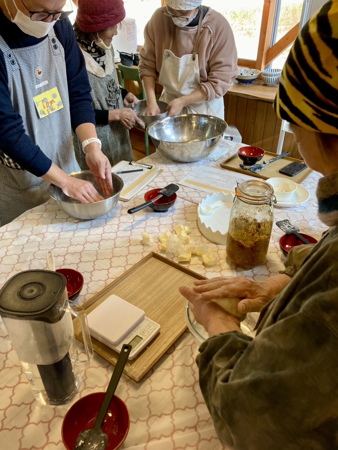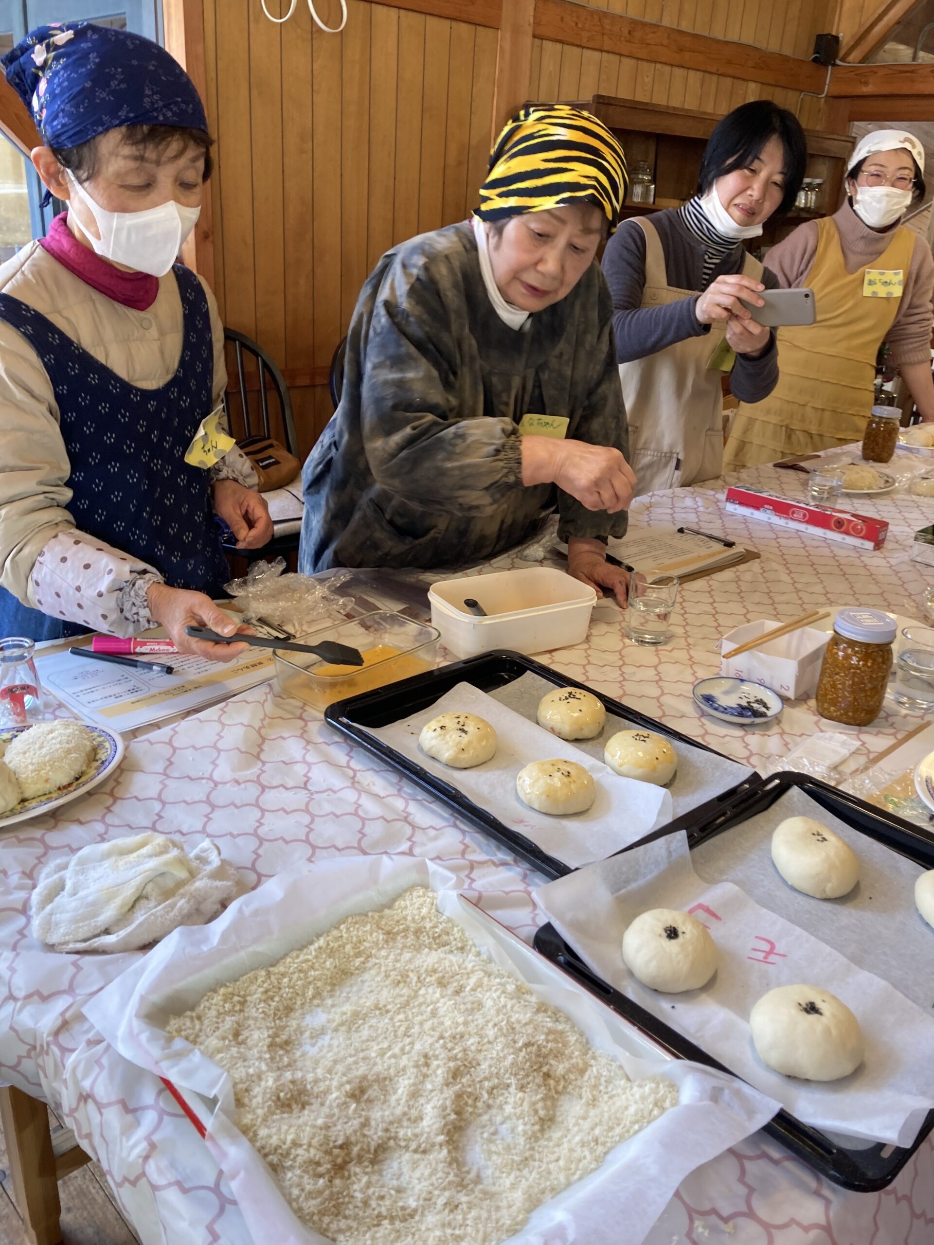 パンを「カレー麹を使ったカレーパン」と「砂糖を使わず麹と小豆と米で作った発酵あんこのあんぱん」を作りました。 気温が寒い中のパン作りでしたので、部屋の中を十分に暖めてからの作業となりました。 パンをこねながら皆さんの普段の生活の話から得意な料理の話などさまざまなことで笑いながら、和気あいあいと作業は進んでいきました。