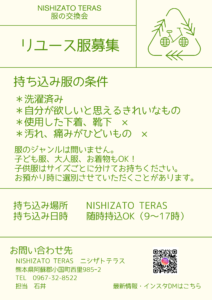 NISHIZATO TERASでは、リユース服のお持込みを随時受け付けています。