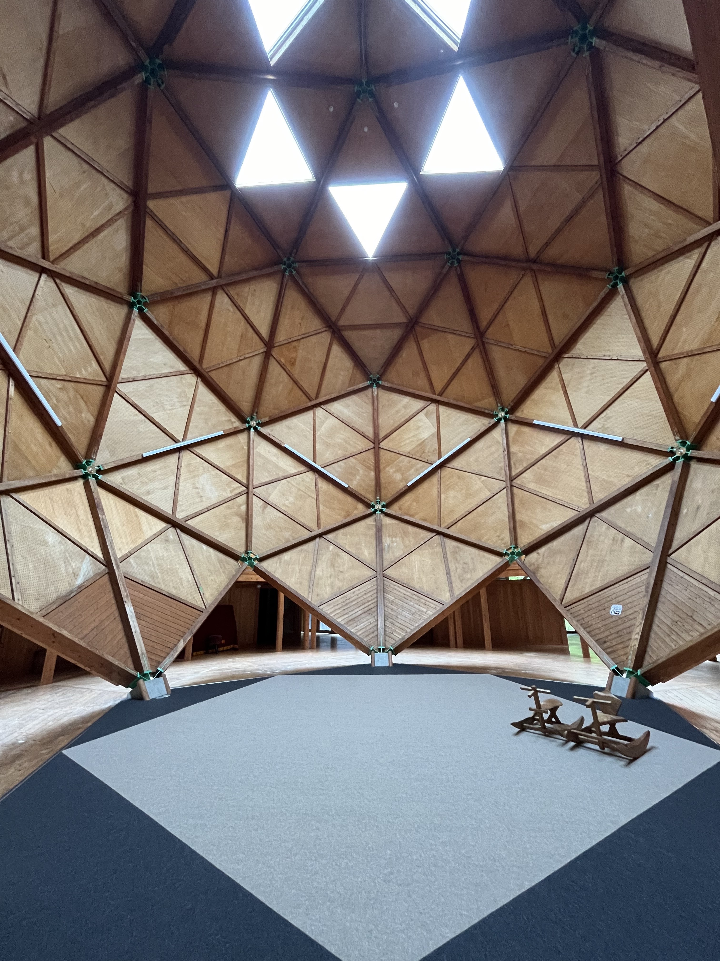 西里小学校の中央ドームは木島氏のキャリアに大きな影響を与えたアメリカの建築家バックミンスター・フラーのジオデシック・ドーム(通称フラードーム)をベースに56面体の木工トラス構造で建築されています。